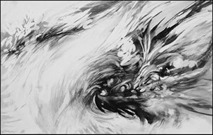 similar worlds within the mimetic rainforest of the inner city arcadia of Mt Coot-tha Botanical Gardens. The exhibition consists primarily of a series of large gestural,evocative, monochromatic drawings which contrast with a selection of thought provoking, digitally manipulated images based on the same sites – a rainforest creek and an inner city arcadia. Also a collection of digital images are displayed along the same theme