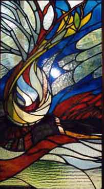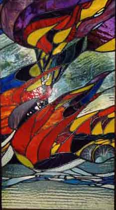 Keeping mind the theme of resurrection the panels represent, form left to right, the transformation from desolate life to new life. through the presence of the Holy Spirit, represented by the traditional symbols of fire and water, new life emerges.