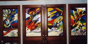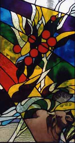 Gordon Slack Commissioned and created in glass the Resurrection Windows at St Matthew's Anglican Church. He wanted a design to do with resurrection and also to be relevant to the district of Gayndah. Gayndah was in the grips of a severe drought at the time. A bottle tree clinging onto the desolate slop of a small hill near the town caught my attention. Gordon is also a cattle farmer and other produce in the region included citrus.